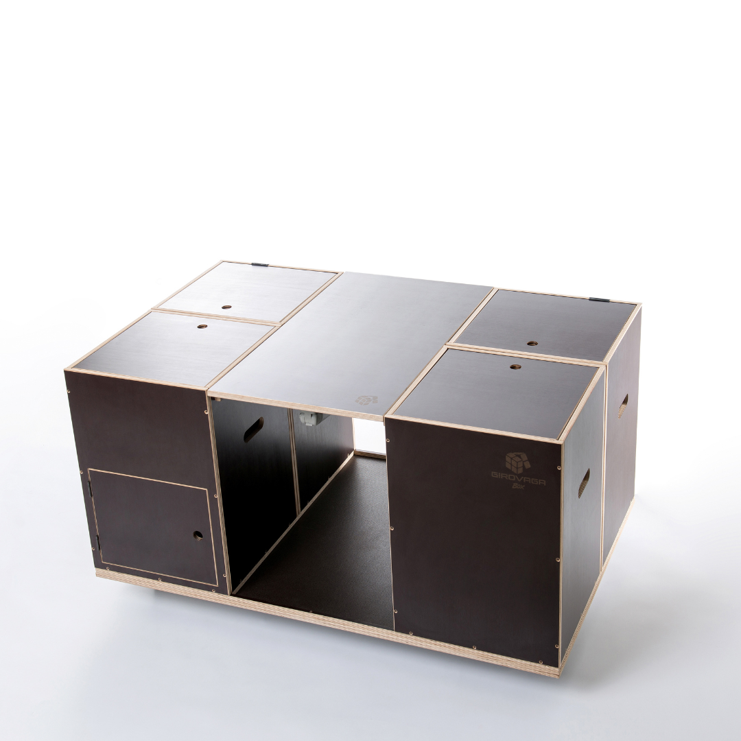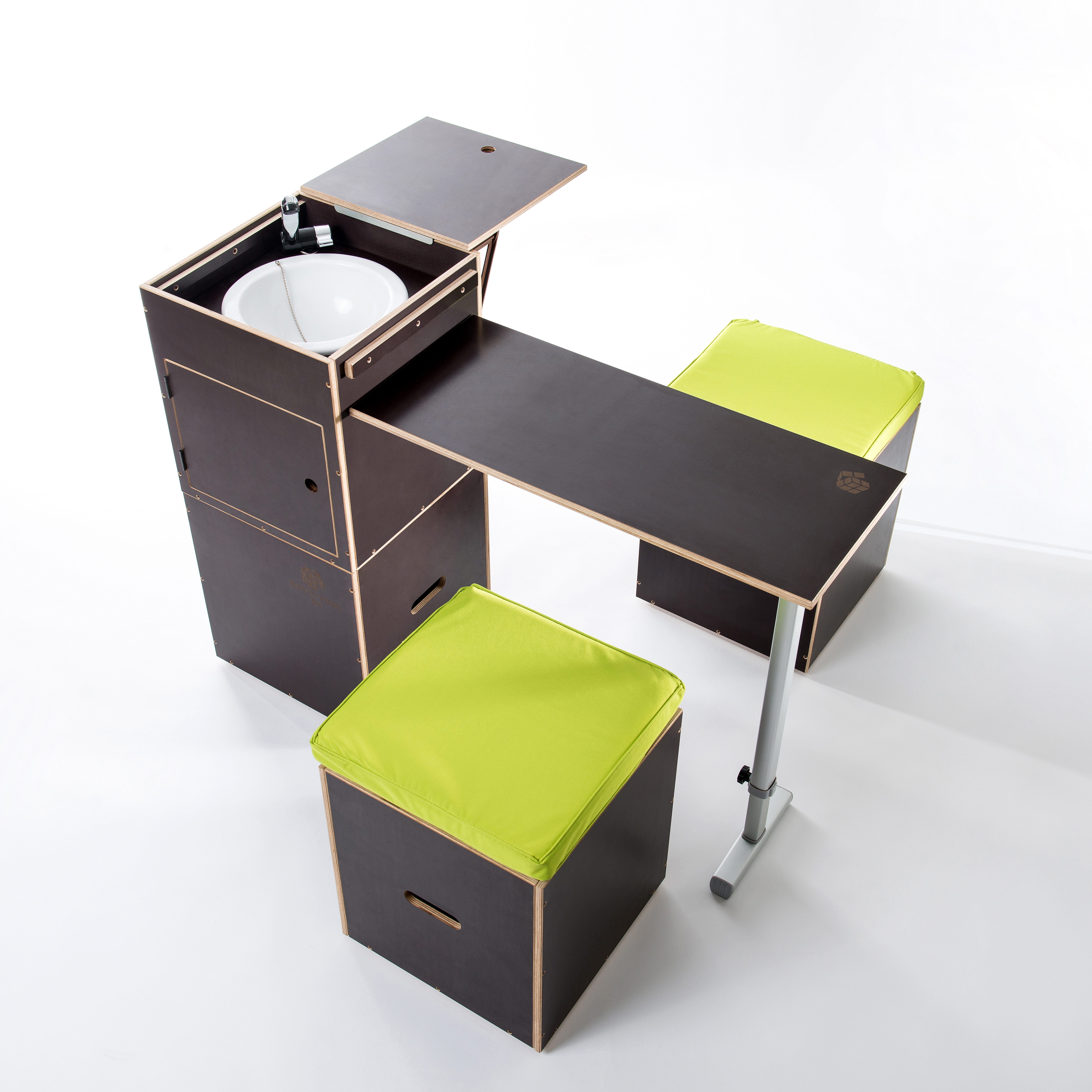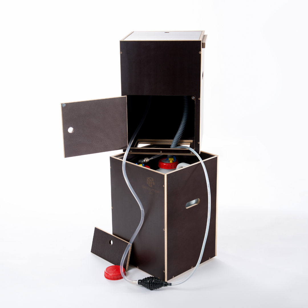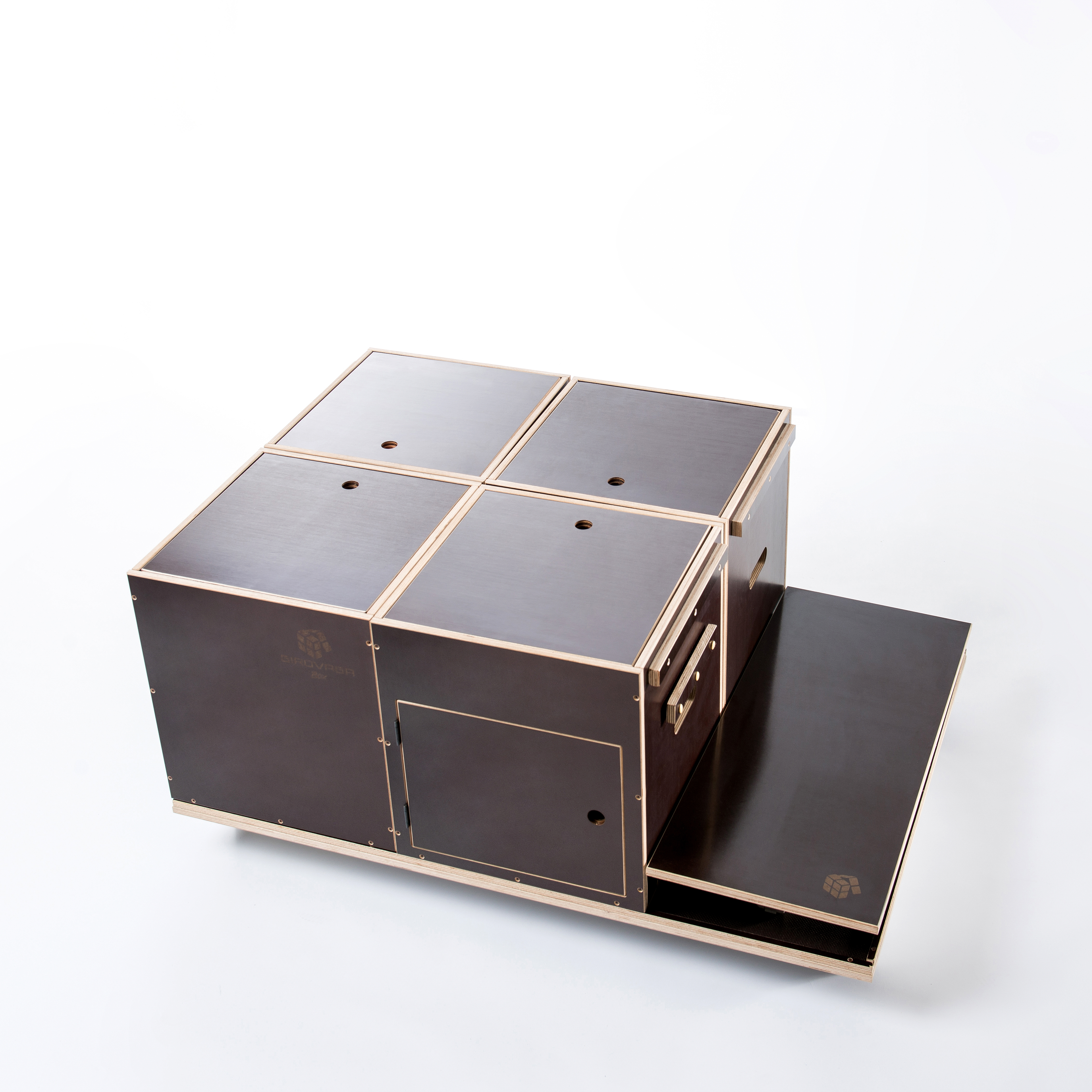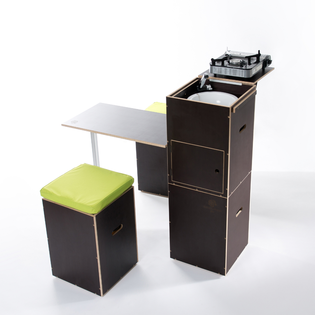 Il kit è composto da quattro box, da due pianali e un tavolo, con i relativi supporti. Sono presenti due box vuoti e due box contenitori che offrono spazio per un lavandino e rubinetto, due taniche.