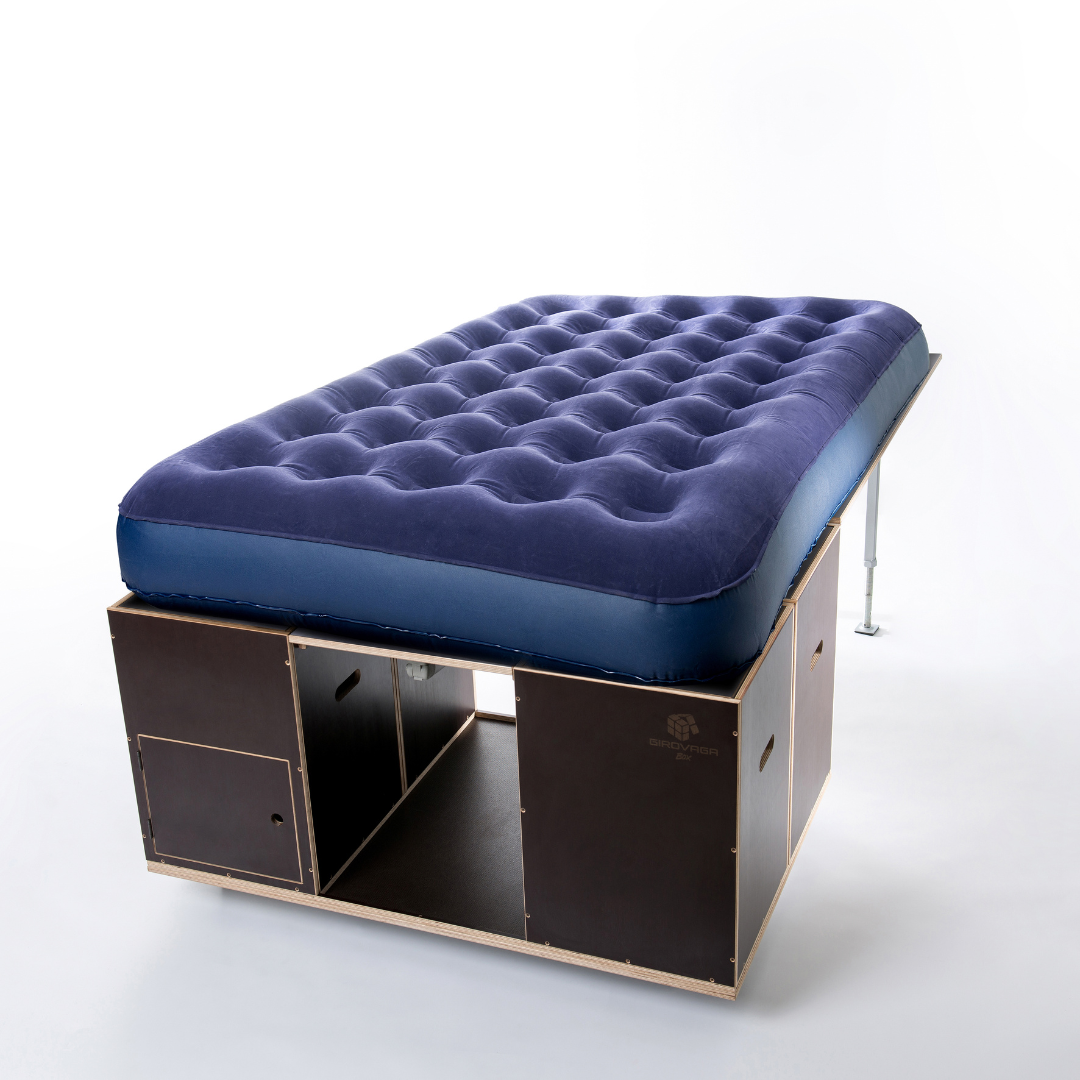 È comprensivo di un materasso matrimoniale, due cuscini, un fornelletto e delle cinghie necessarie per il trasporto del kit.